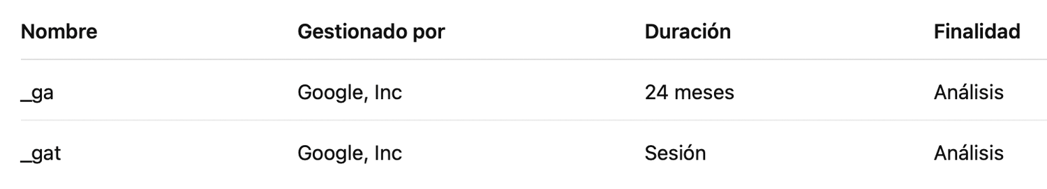 En el caos de esta web, las cookies que se usan son las siguientes: